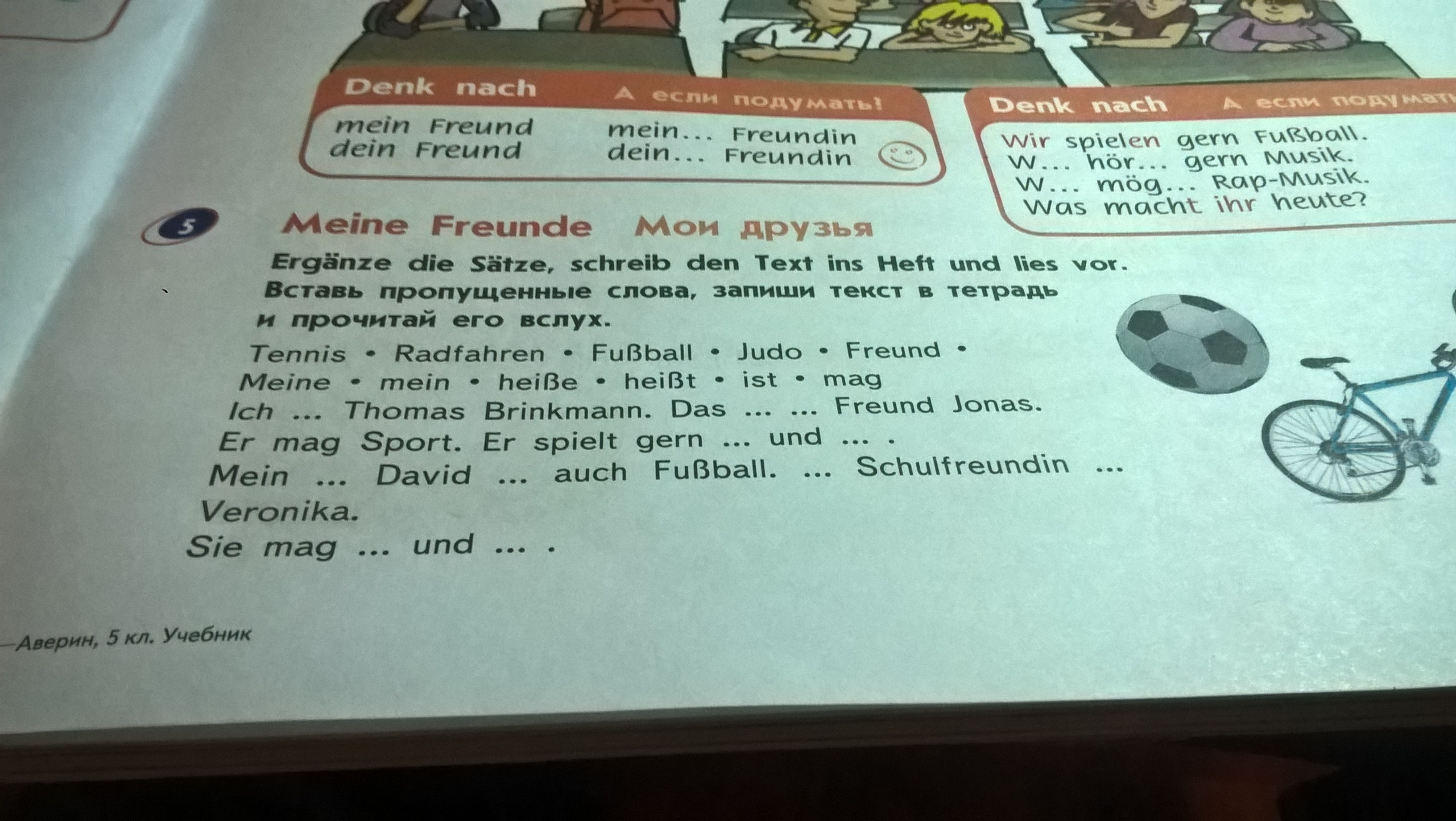 Меня зовут Томас Бринманн. Это мой друг Йонас. Он любит спорт. Он с удовольствием играет в теннис и футбол. Мой друг Давид тоже любит футбол. Мою школьную подругу зовут Вероника. Она любит кататься на велосипеде и заниматься дзюдо.