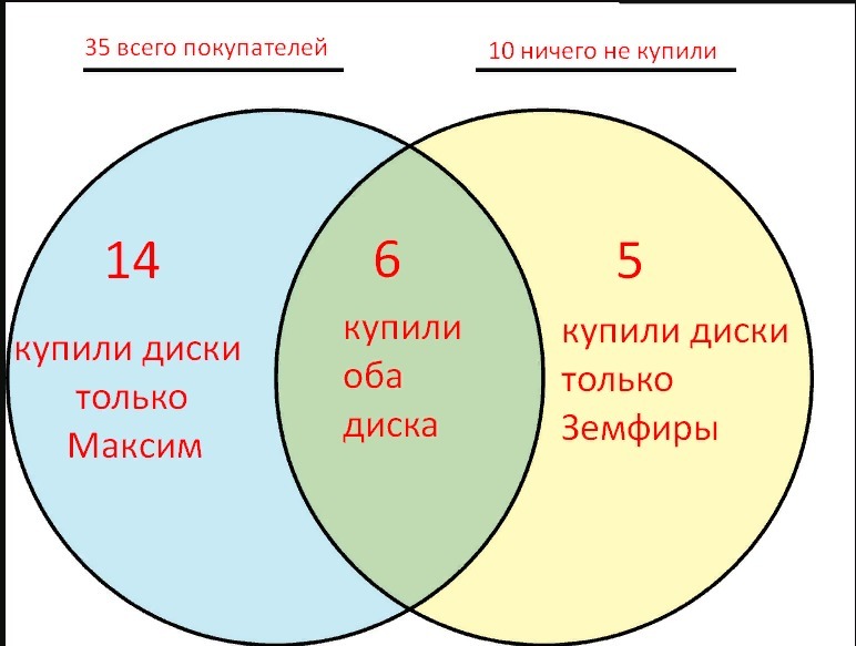 В магазин «Мир музыки» пришло 35 покупателей. Из них 20 человек купили новый диск певицы Максим, 11 – диск Земфиры, 10 человек не купили ни одного диска. Сколько человек купили диски и Максим, и Земфиры?