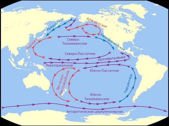 Течения в Тихом океане совпадают с постоянно дующими ветрами.Там где дуют пассаты ,там течения перемещаются на запад,а там,где дуют западные ветры-там водные массы перемещаются на восток.Но следует учитывать силу вращения Земли вокруг своей оси,которые отклоняют течения в южном полушарии влево,а в северном полушарии вправо.