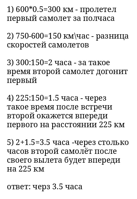 самолет вылетел со скоростью 600км/ч Через 0,5 ч вслед за ним вылетел другой самолет со скоростью 750 км/ч Через сколько часов после вылета второй самолет будет впереди на 225 км?