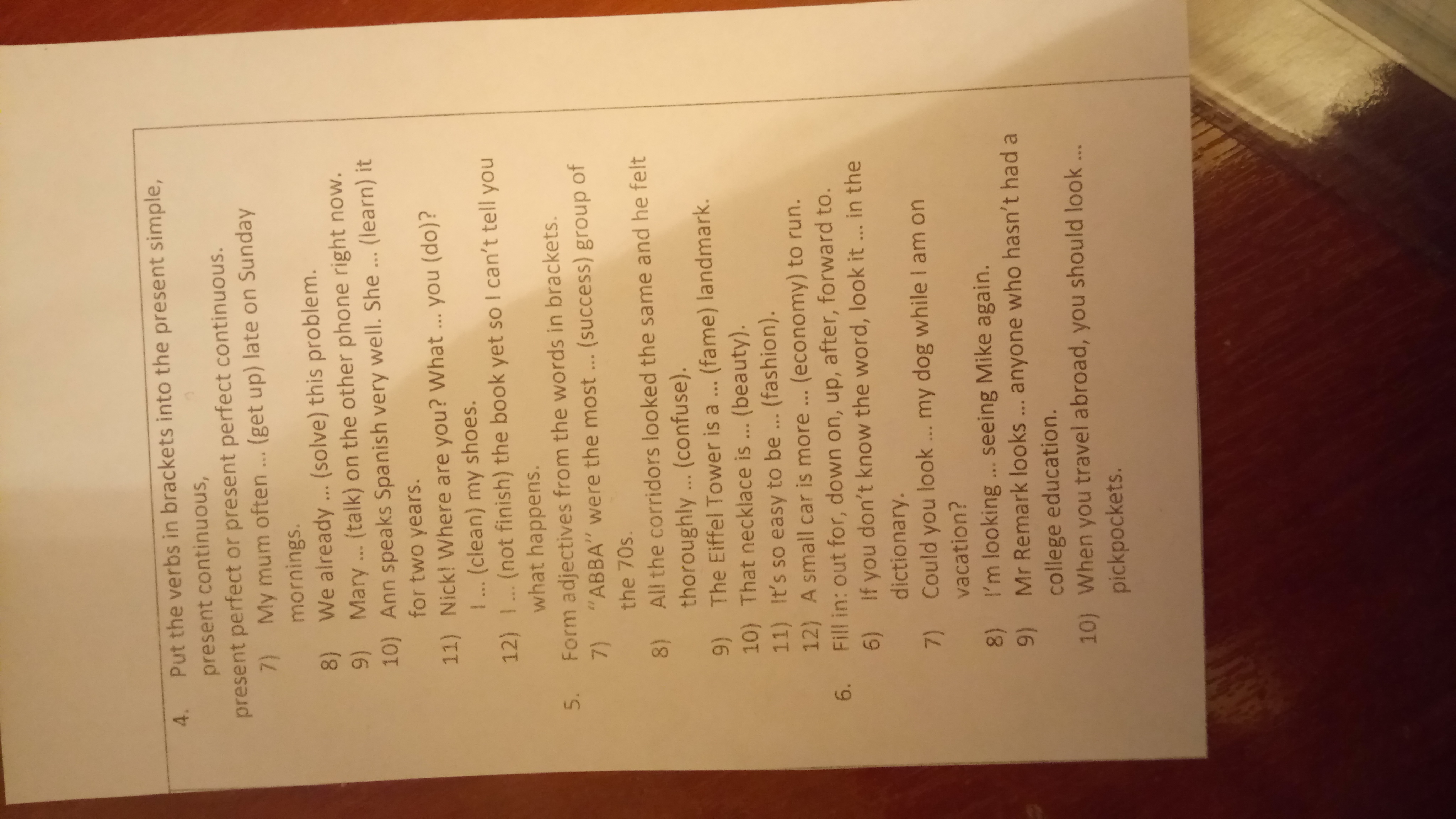 №4 7. gets up 8.have already solved 9.is talking 10. has been learning. 11what are you doing? I'm clearning.12. I haven't finished