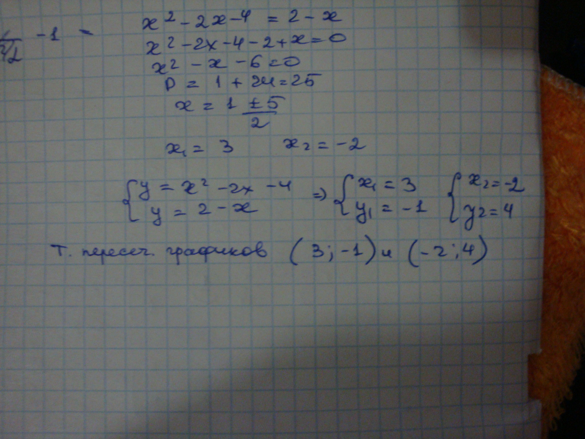 СРОЧНО!!!!! Не выполняя построения, найти координаты точек пересечения графиков функций: y=x^2-2x-4 и y=2-x