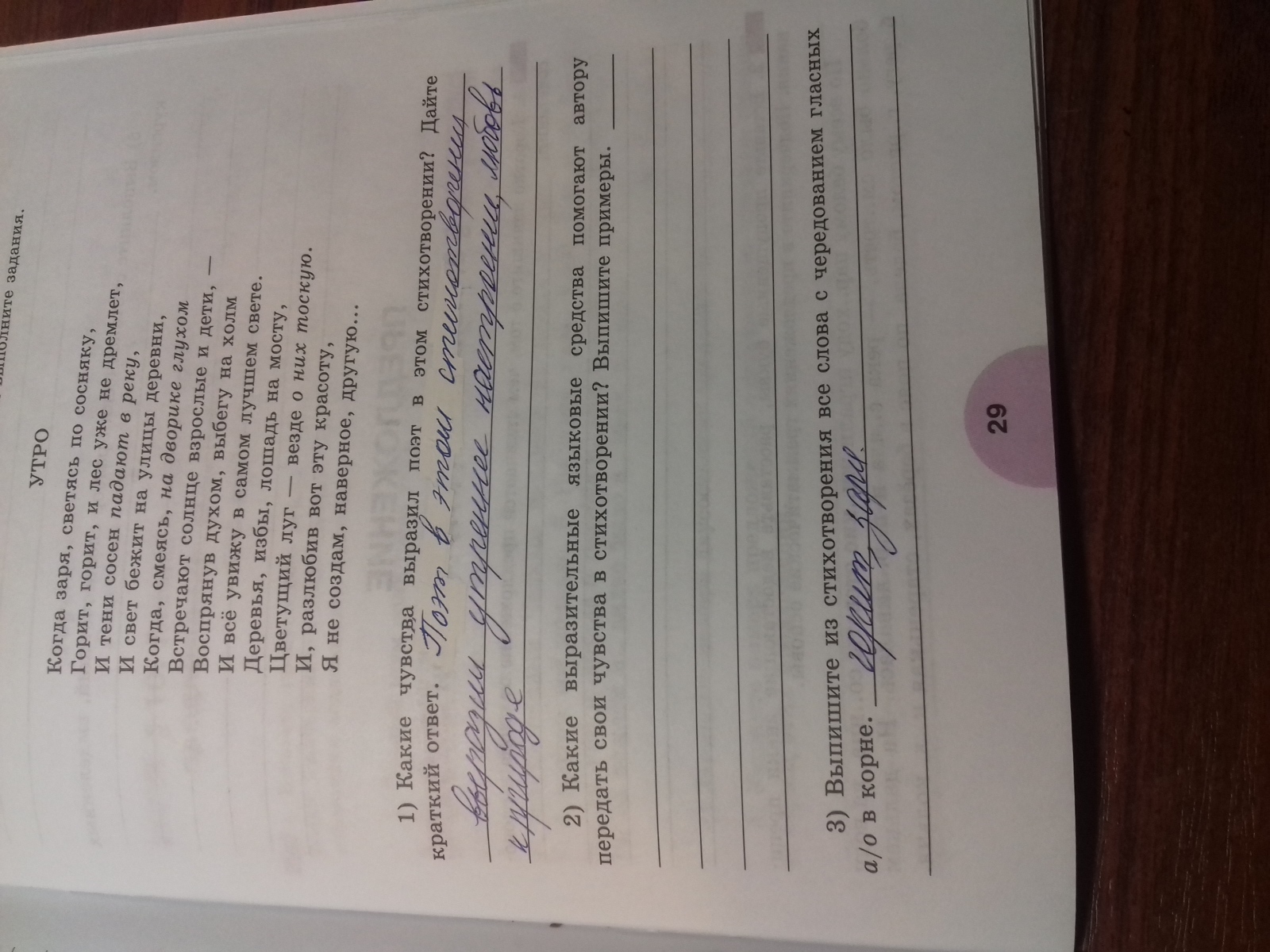 Рубцов "Утро"<br />Вопросы<br />1)какие чувства выразил поэт в этом стихотворении?Дайте краткий ответ.<br />2)какие выразительные языковые средства помогают автору передать свои чувства в стихотворении?Выпишите примеры.<br />3)выпишите из стихотворения все слова с чередованием гласных а/о в корне<br />4)выпишите из стихотворения 6 слов с проверяемой безударной гласной в корне. <br /><span><br />Когда заря, светясь по сосняку,<br /><br />Горит, горит, и лес уже не дремлет,<br /><br />И тени сосен падают в реку,<br /><br />И свет бежит на улицы деревни,<br /><br />Когда, смеясь, на дворике глухом<br /><br />Встречают солнце взрослые и дети,—<br /><br />Воспрянув духом, выбегу на холм<br /><br />И все увижу в самом лучшем свете.<br /><br />Деревья, избы, лошадь на мосту,<br /><br />Цветущий луг — везде о них тоскую.<br /><br />И, разлюбив вот эту красоту,<br /><br />Я не создам, наверное, другую...</span>