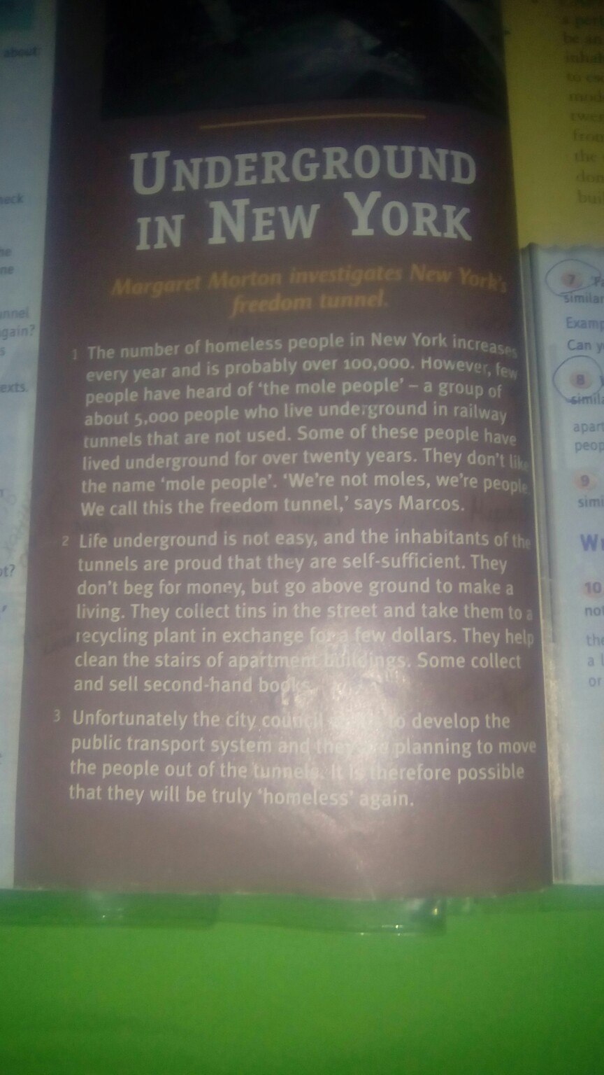 1. 'Mole people' have lived in the tunnels over twenty years. 2. They collect tins in the street and take them to a recycling plant in exchange for a few dollars. 3. Their homes in danger becouse city council starts to develop public transport system in the tunnels. 4. Some people choose to live in caves in Central Turkey because they like the clean air