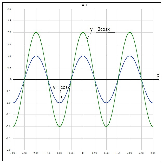 Чтобы построить график данной функции, нужно растянуть график функции y = cosx от оси X с коэффициентов 2.
