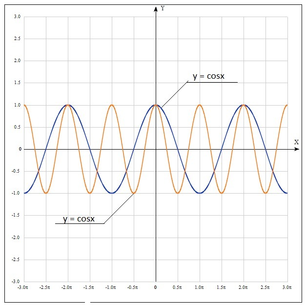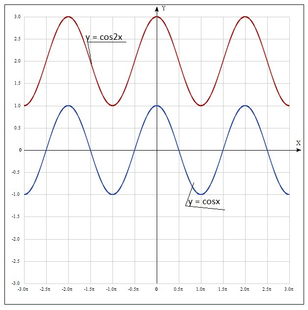 Чтобы построить график данной функции, нужно сжать график функции y = cosx к оси Y с коэффициентов 2.