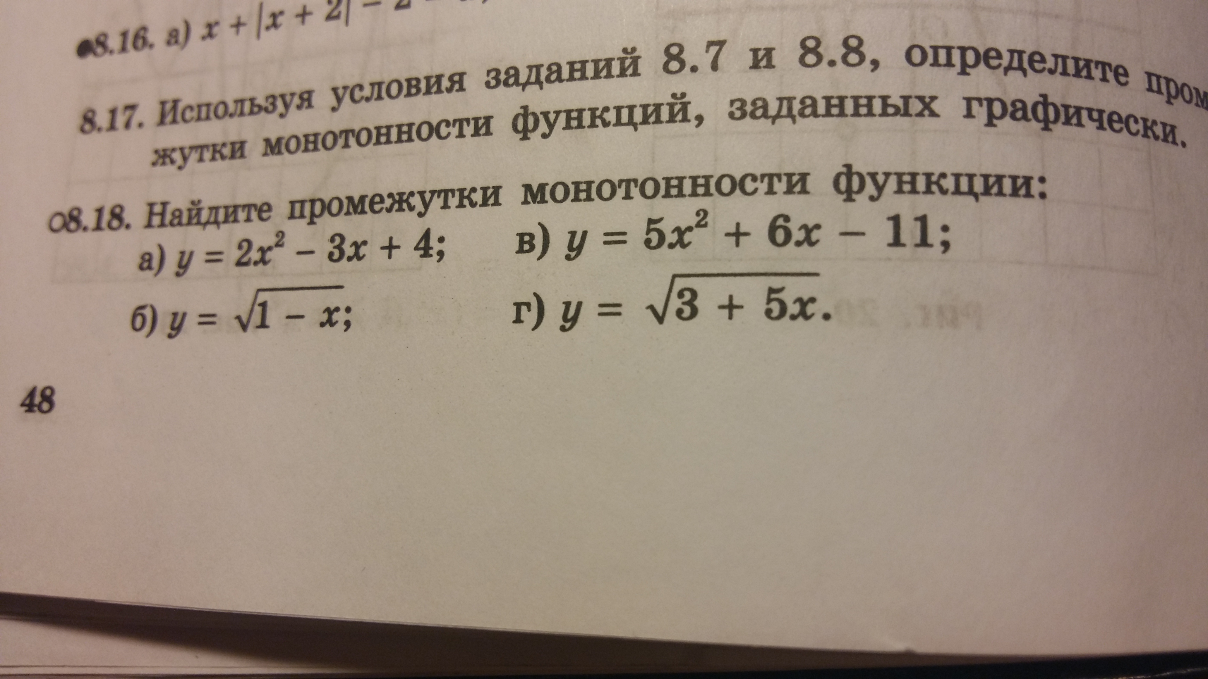А ученик знает как выделять полный квадрат из квадратного трехчлена? Может надо расписать подробнее?Где-то так =5(х^2+6x/5-11/5)=5(x^2+2*x*3/5+9/25-9/25-11/5)=5((x+3/5)^2-64/25)=5(x+3/5)^2-64/5. Отсюда видно,что при х= - 3/5 -Это вершина параболы! Следовательно от - беск. до - 3/5 -функция убывает, т.к. ветви параболы направлены вверх.Хотя можно гораздо проще: х вершины= - b/2a= - 6/10= - 3/5 - и нет необходимости выделять полный квадрат!