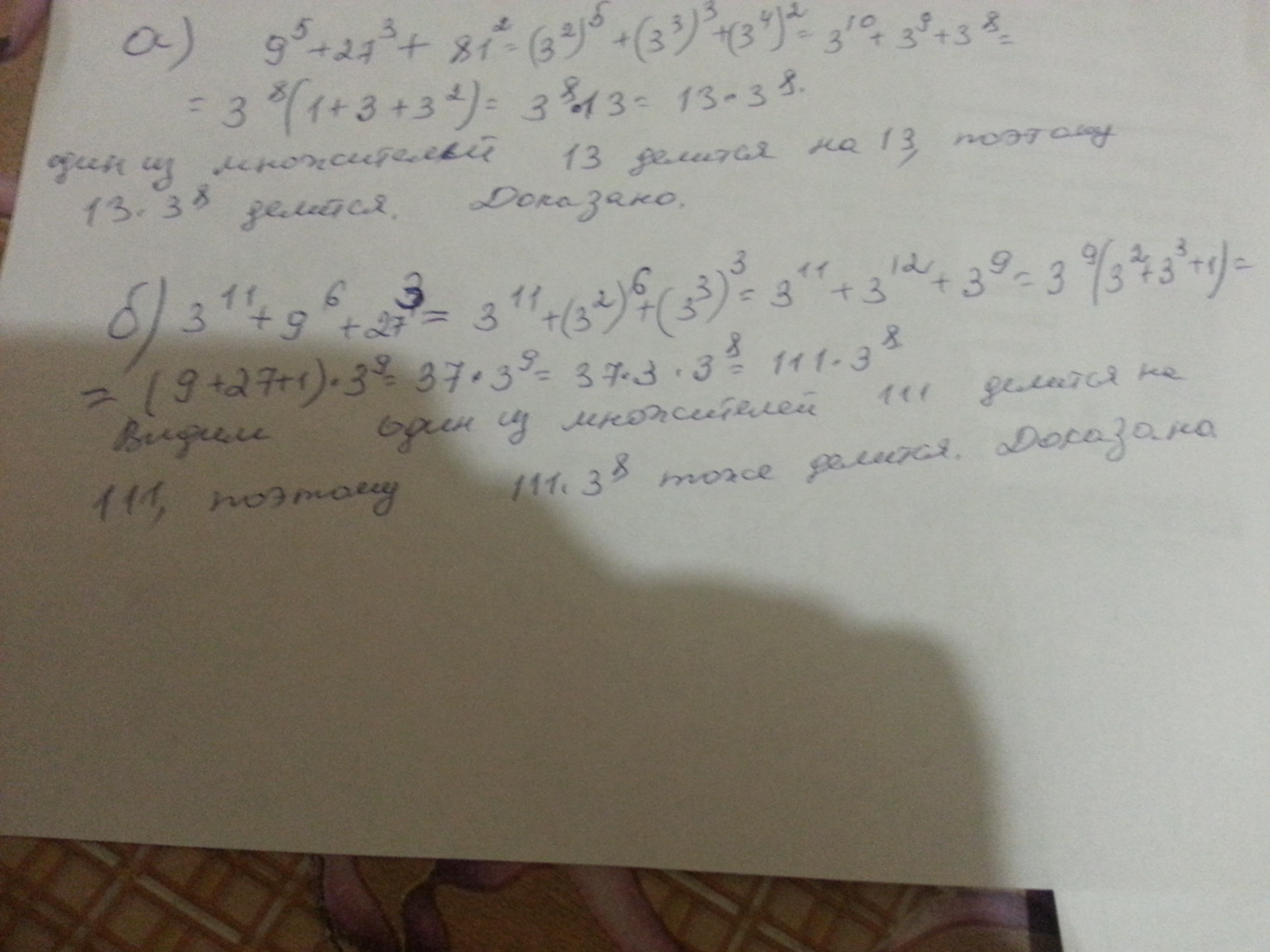 Б) 9 в 5 степени + 27³ + 81² делится на 13