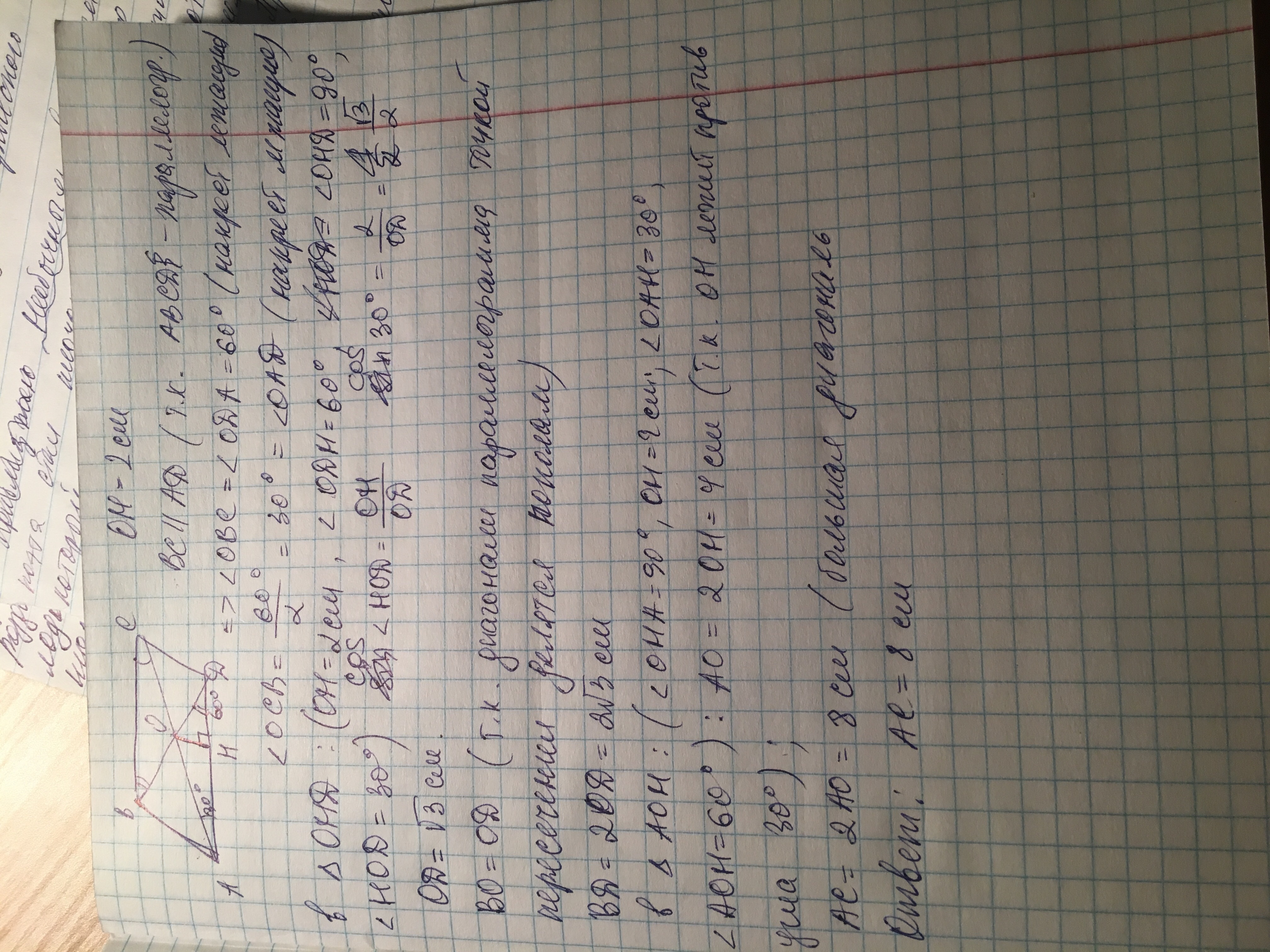 Точка О - точка пересечения диагоналей параллелограмма ABCD - удалена от прямой AD на расстояние, равное 2 см. Известно, что <OCB в два раза меньше,чем <OBC. Вычислите длину большей диагонали параллелограмма ABCD, если <ODA = 60 градусов.