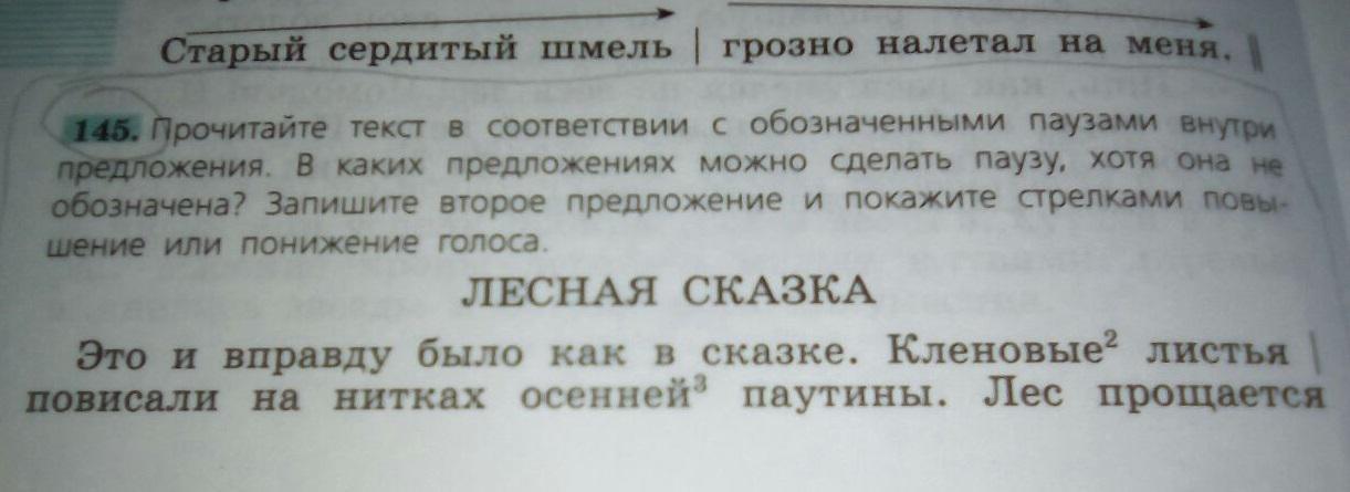 прочитайте текст в соответствии с обозначенными паузами внутри предложения.В каких предложениях можно сделать паузу, хотя она не обозначена? запишите второе предложение и покажите стрелками повышение или понижение голоса:Кленовые листья повисали на нитках осенней паутины