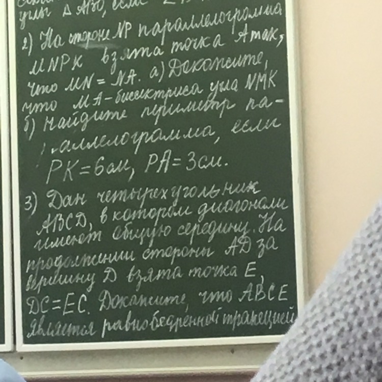 1. Угол NAM = углу AMK так как накрест лежащие углы при параллельных прямых и секущей равны. (В параллелограмме противоположные стороны параллельны).