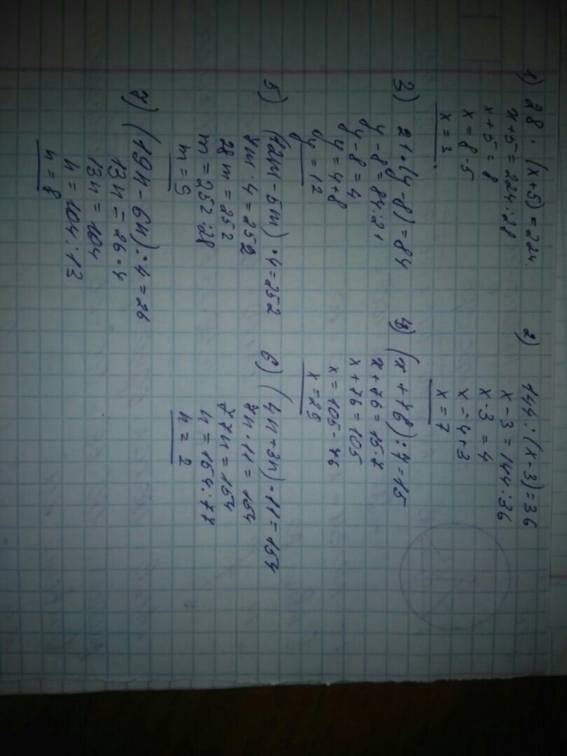 как решить уравнение 28 ×(х+5) =224 144:(х-3)=36 21×(у-8)= 84 (х+76):7=15 (12m-5m)×4=252 (4n+3n)×11=154 (19n-6n):4=26