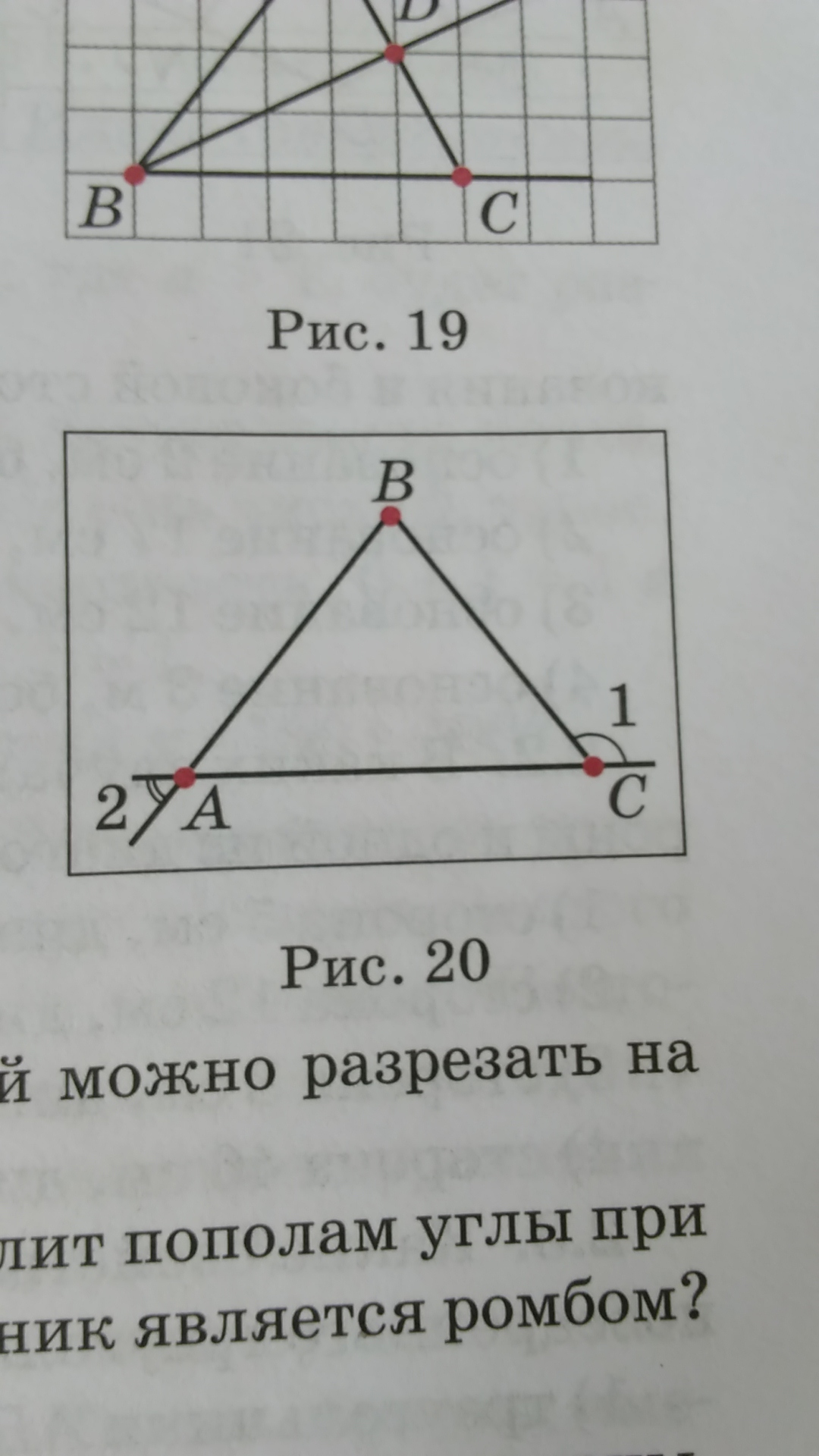 На рис 20 изображен равнобедренный треугольник ABC с вершиной B .Угол отмеченный цифрой 1 равен 130°,сколько равен угол 2?