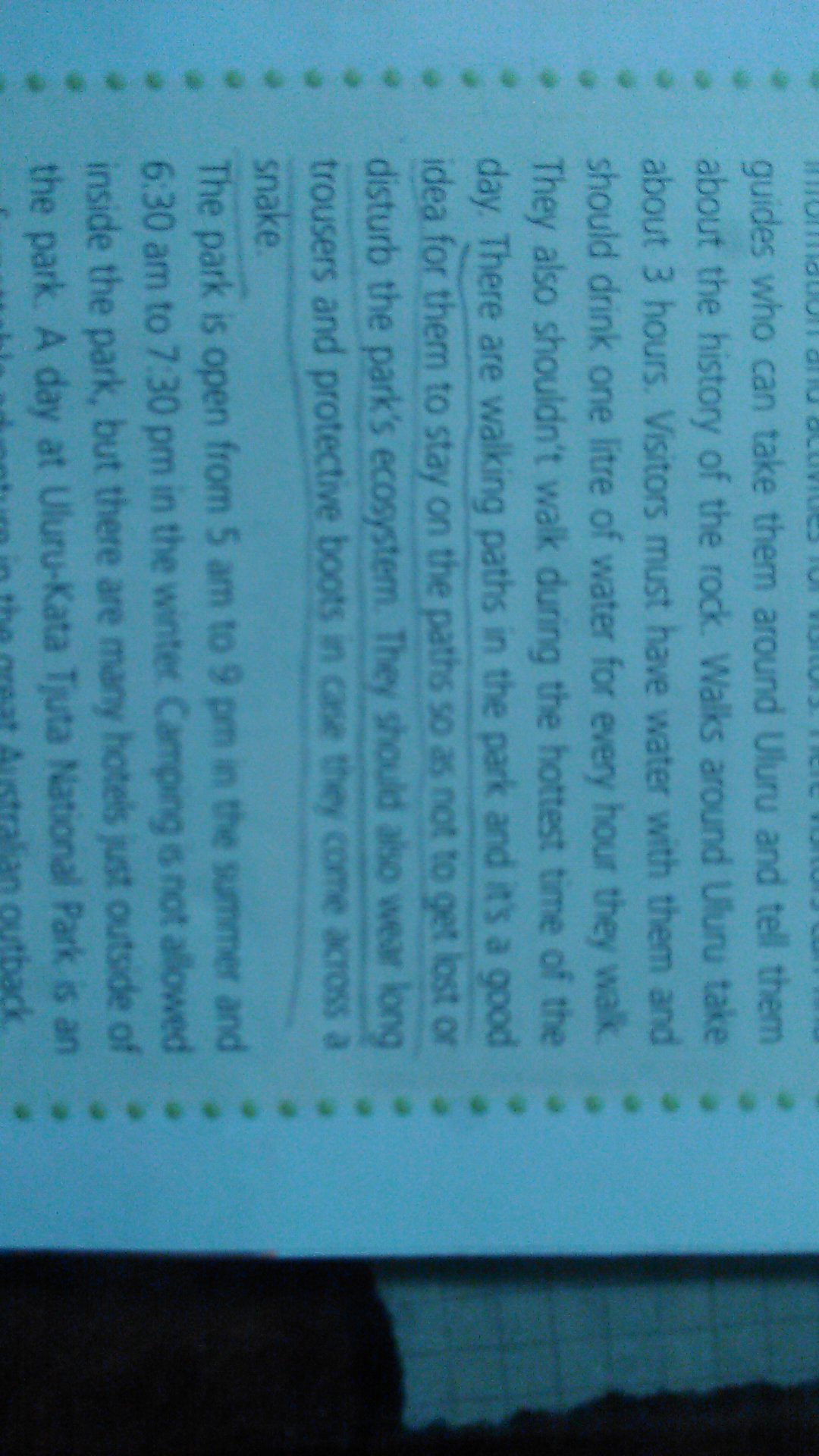 Есть пешеходные дорожки в парке, и это хорошая идея для них, чтобы остаться на пути, чтобы не заблудиться или нарушить экосистему парка.Они также должны носить длинные брюки и защитные сапоги в случае, если они попадаются змеи.