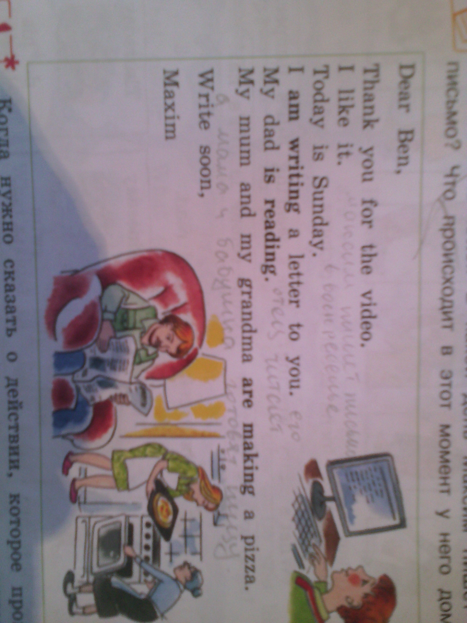 Диэ Бэн, Сэнкью ю фо зэ видео. Ай лайк ит. Тудэй ис Сандэй. Ай эм райтин э лэтэ ту ю. Май дэд ис ридин. Май мам энд май грэндма а мэйкин э питса. Райт сун. Мэксим.