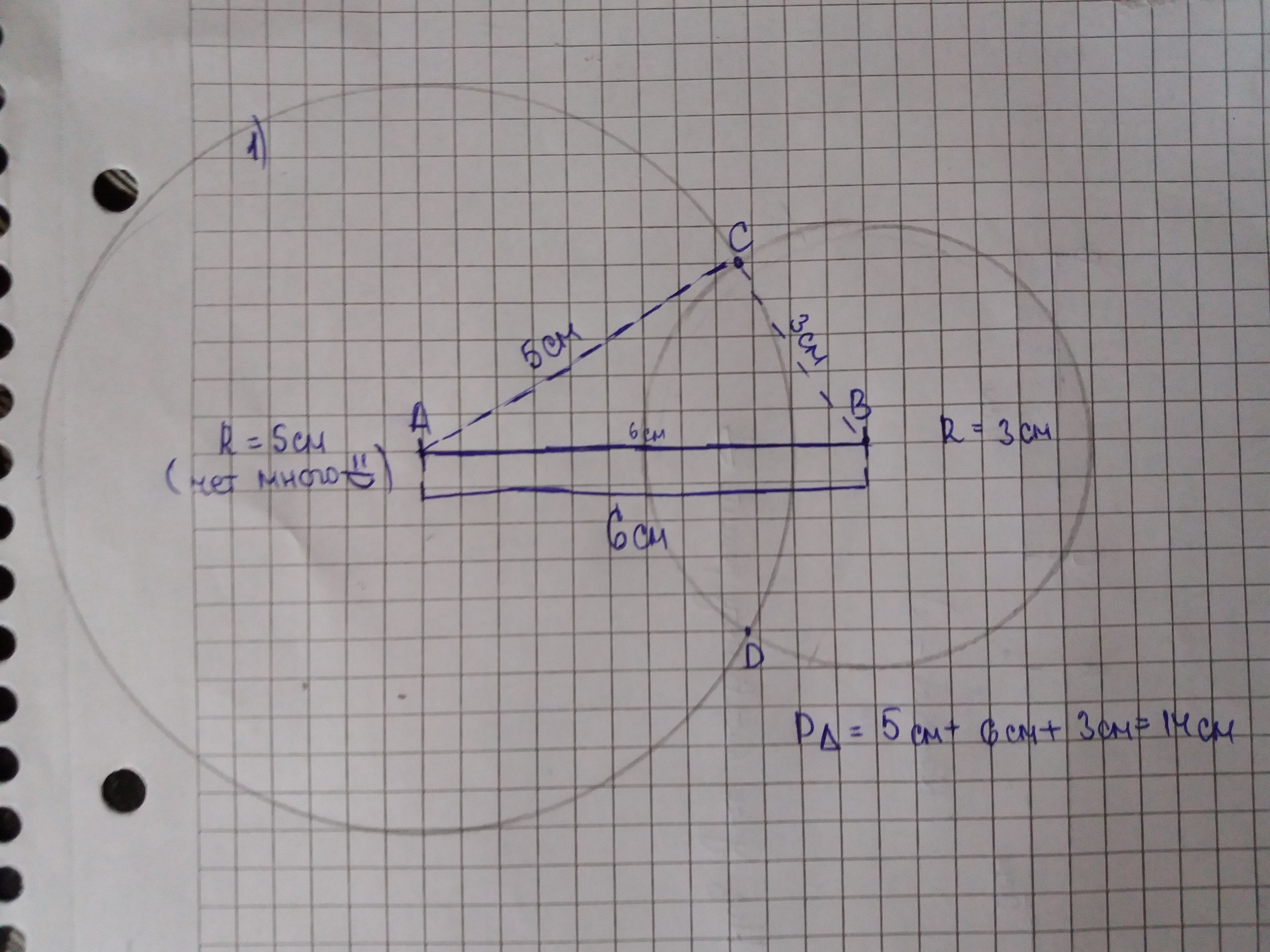Начертите отрезок AB длиной 6 сантиметров Начертите окружность с центром в точке А радиусом 5 и окружности с центром в точке B и радиусом 3 сантиметра обозначьте точки пересечения окружностей буквами C и D Найдите периметр треугольника АВС