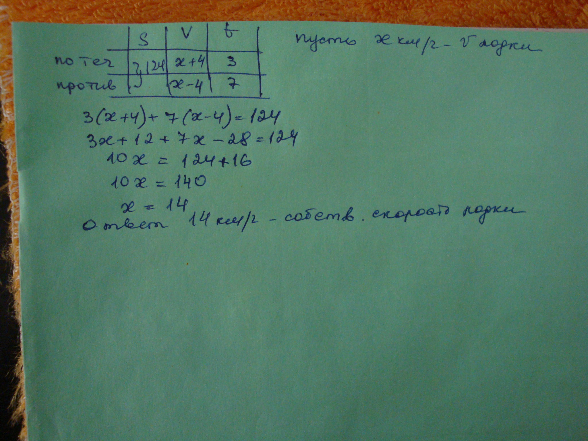 Моторная лодка плыла 3 часа по течению реки и 7 часов против течения, пройдя за это время 124 км. Найдите собственную скорость лод-ки, если скорость течения реки 4 км/ч.