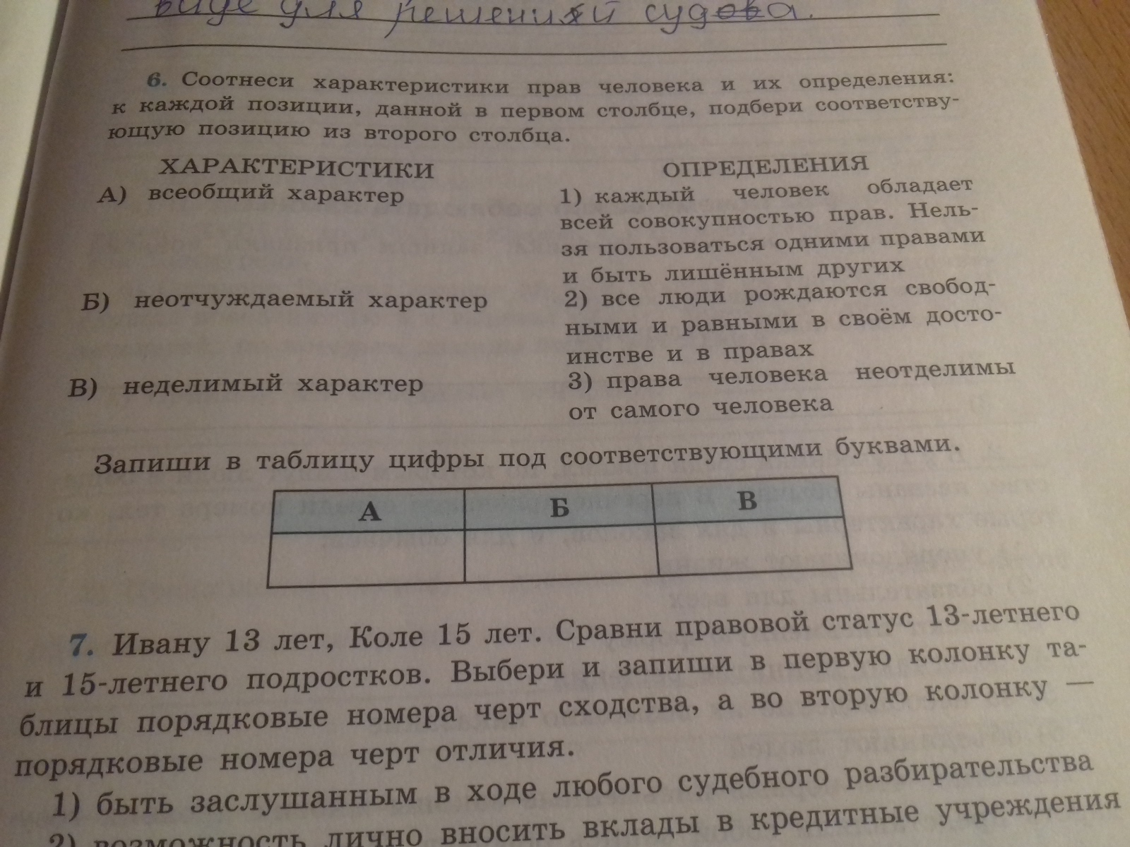 соотнеси характеристики прав человека и их определения : к каждой позиции, данной в первом столбце , подбери соответствующую позицию из второго столбца. (см. фото)