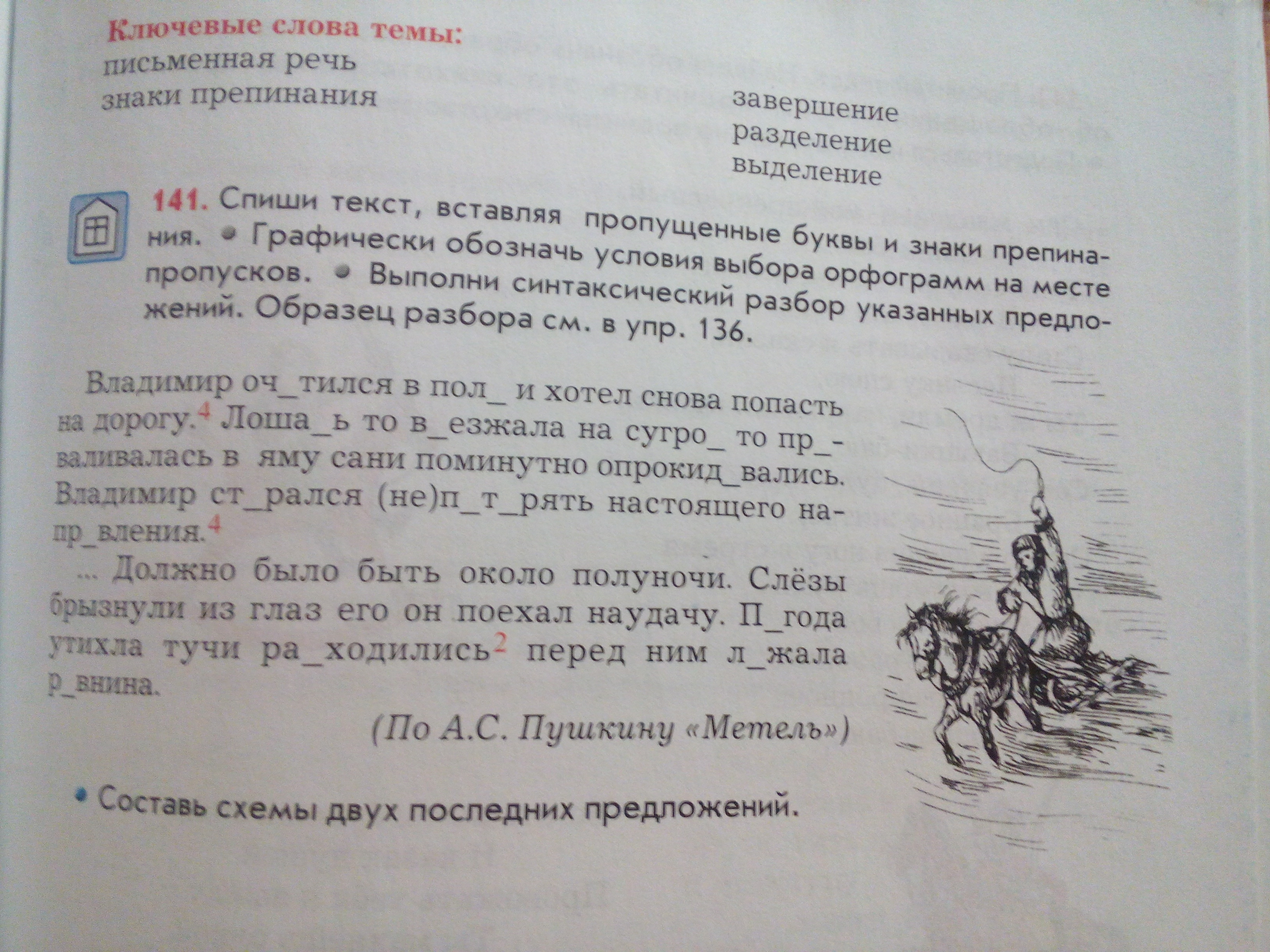 Владимир очутился в поляне ихотел снова попасть на дорогу. лошадь то въезжала на сугроб то проваливалась в яму сани поминутно опрокидывались. Владимир старался не потерять настоящего направления. Должно было быть около полуночи. Слезы брызнули из глаз его, он поехал наудачу. Погода утихла тучи расходились перед ним лежала равнина.