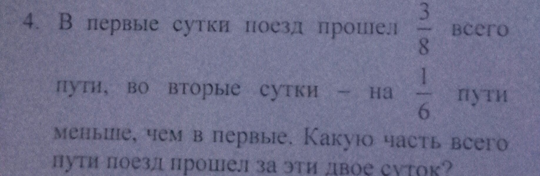 3/8 +(3/8-1/6)=3/8+3/8-1/6=6/8-1/6=3/4-1/6=9/12-2/12=7/12 часть пути прошёл поезд за эти два дня!