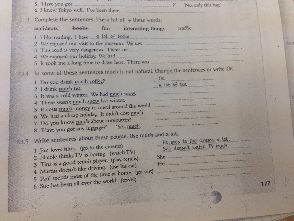 3.ok4.ok5.ok6.ок7.ок8.a lot.Дело в том,что здесь везде подойдёт и much и a lot of.Так как здесь все существительные-не исчисляемые.А lot of употр.Как с исчисл.,так и неисчисл.сущ. 3.5 3.she plays tennis a lot,4Martin doesn't use his car much.5.Paul doesn't go out much.6.Sue has travelled all over the world a lot
