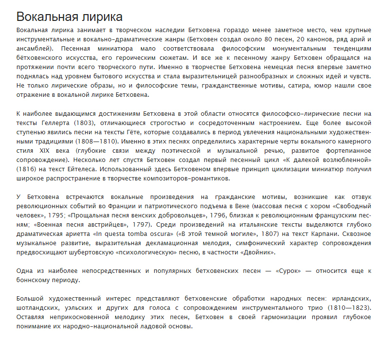 Вокальная лирика занимает в творческом наследии Бетховена гораздо менее заметное место, чем крупные инструментальные и вокально-драматические жанры