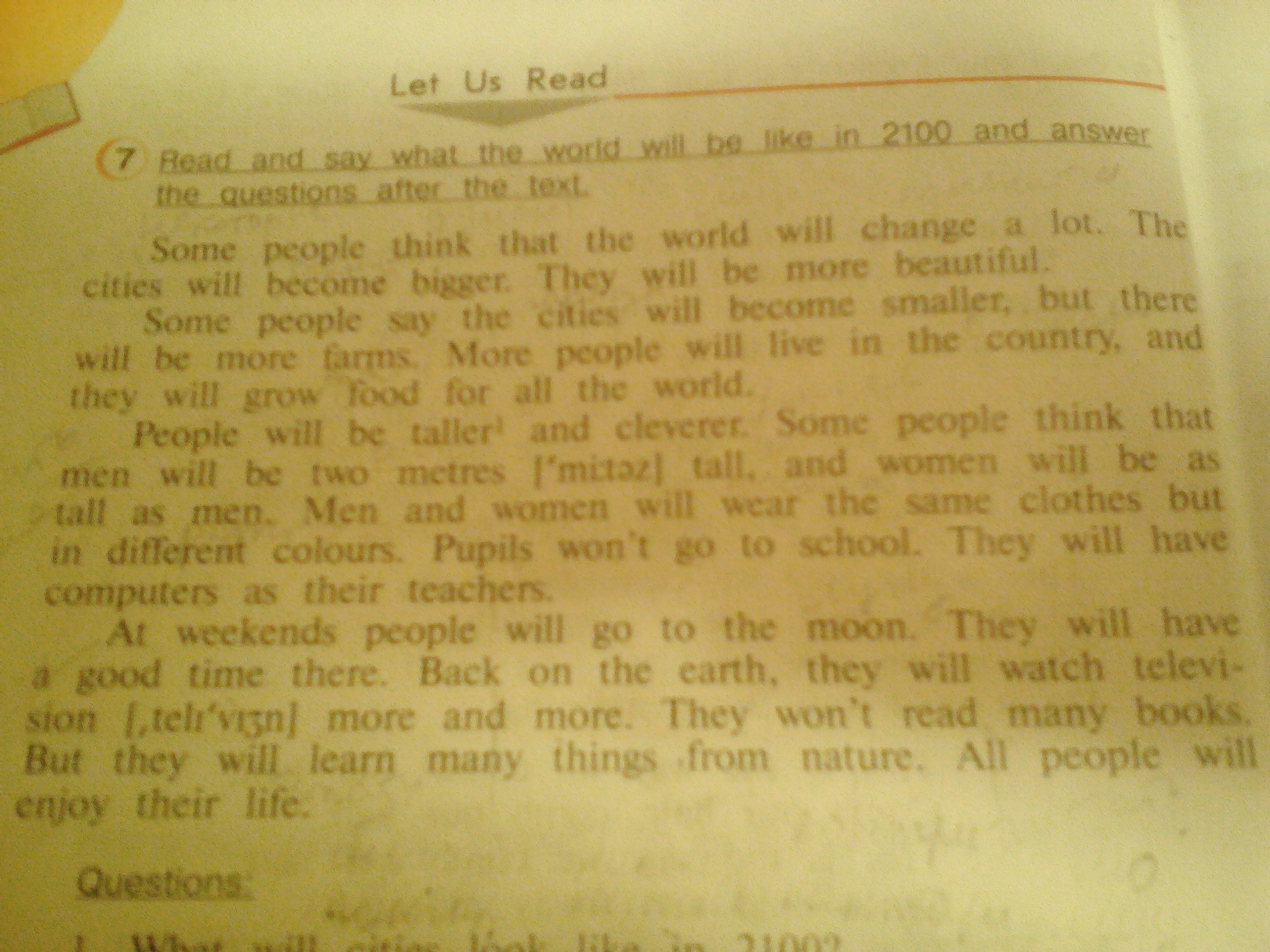 Некоторые люди думают, что мир изменится многое. Города будут становиться все больше. Они будут более красивыми. Там будет больше парков и деревьев в них. Некоторые люди говорят, что там не будет много людей в городах и города станут меньше, но там будет больше ферм. Все больше людей будут жить в стране, и они будут выращивать пищу для всего мира. Люди будут выше и умнее. Некоторые люди думают, что мужчины будут два метра, а женщины будут столь же высоки, как мужчины. Они говорят, что мужчины и женщины будут носить ту же одежду, но в разных цветах. Учащиеся не будут ходить в школу. Они будут иметь компьютеры дома и компьютеры помогут им узнать все. В выходные дни люди будут идти на Луну и другие планеты. Они будут иметь хорошее время там. Они не будут читать много книг. Они будут в основном смотрели телевизор и получать новости от компьютерных сетей. И они узнают много вещей, от природы. Все люди будут наслаждаться своей жизнью