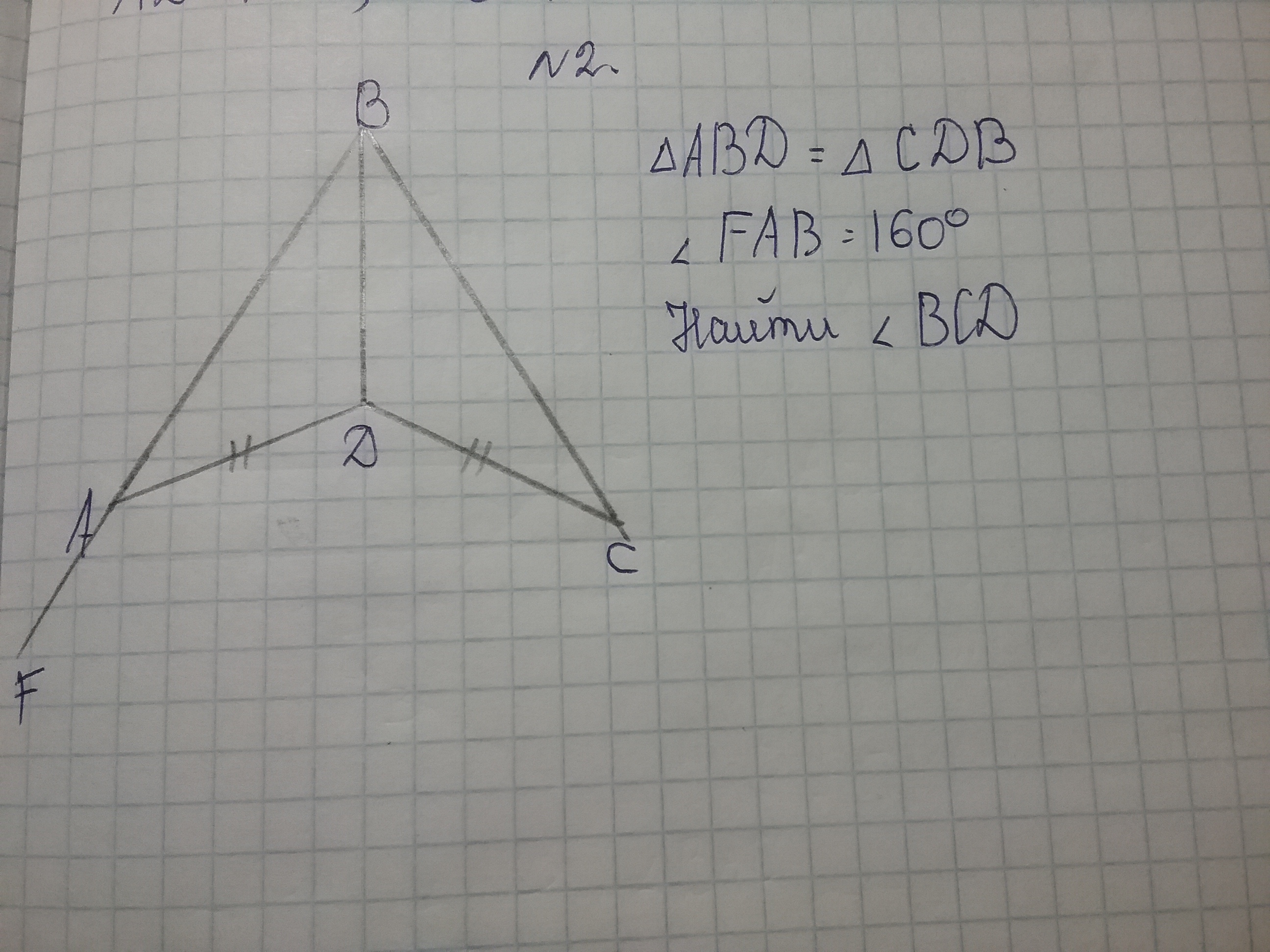 рассмотрим треугольник АВD. угол ВАD= 180°- угол FAB= 20°( смежный угол) --> ВСD = 20° тк треугольники равны