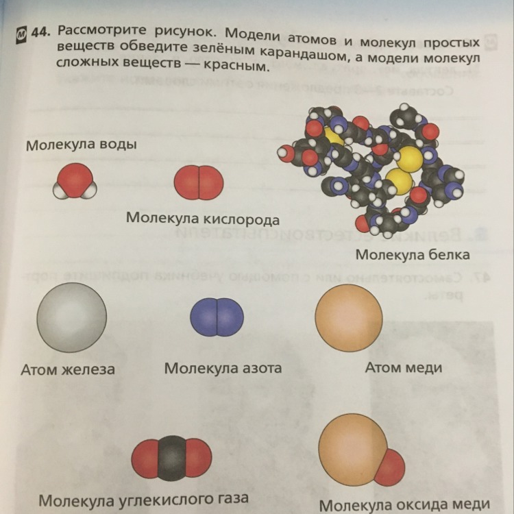 Рассмотрите рисунок модели атомов молекул простых веществ обведены зелёным карандашом а молекулы сложных веществ красным