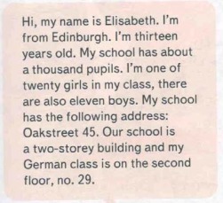 Hallo, mein Name ist Elisabeth. Ich bin aus Edinburgh. Ich bin dreizehn Jahre alt. Meine Schule hat ungefähr eintausend Schülern. Ich bin eine von zwanzig Mädchen in meiner Klasse, es sind auch elf Buben (Jungen). Meine Schuladresse ist: Oakstrasse 45. Unsere Schule ist zweischossig und mein Deutschraum ist auf dem zweiten Stock, Nummer 29.