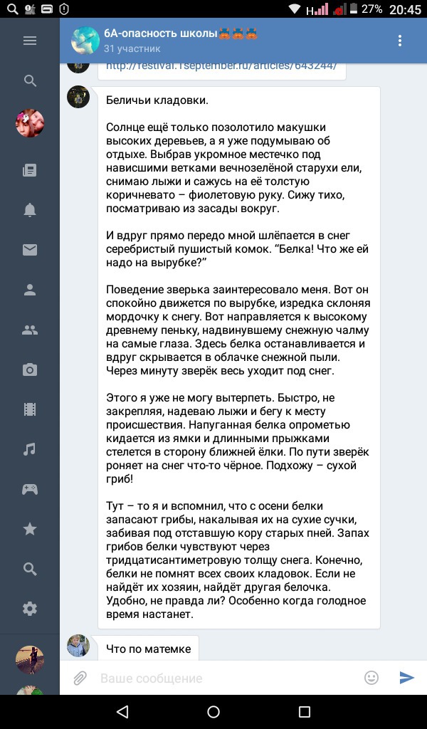Сентябрь. Все чаще хмуриться небо, ветер принимается реветь. Подошел первый месяц осени: осень воздуха, осень леса. Невольно начинает желтеть, краснеть, буреть лист на кустах и деревьях. Белка спешит насадить на сучки грибы. исчезают перелётные птицы и отбывают в дальний путь. как память о красном лете - устанавливаются теплые, ясные дни. В спокойном воздухе летят, серебрятся длинные паутинки... И радостно блестит в полях свежая, молодая зелень. В лесу все заботы о новой жизни теперь прерваны до весны. Одни зайчихи все не могут успокоиться, что лето прошло. Октябрь. Воздух опустел. Дождь. Мокнет на изгороди скучная ворона. ей скоро в путь: незаметно наши вороны улетают к югу, а на их место перемещаются родившиеся на севере. Там, на дальнем севере, ворона - первая прилетная птица. У нас - поди разбери ворон: какая наша, какая с севера - все серые. Покончив с лесом, осень принимается за воду. Октябрь - второй месяц осени, осень воды. Чаще по утрам затягиваются лужи леком. Вода уже оскудела жизнью. Рыбы забиваются, где ещё не замёрзла вода. хвостатый тритон все лето прожил в пруду, а теперь выполз зимовать на суше. Прячутся, обмирают ящерки, змеи, лягушки, пауки. Звери - кто переоевается в теплые шубки, кто набивает себе кладовки, кто готовит берлогу. Птицы-кому надо-улетели на юг. Ноябрь, то снег, то грязь. «Не велика у ноября кузница, а на всю Русь в ней оковы куются: ледостав уже на реках, на прудах и на озерах». Исхлётсаны дождями чёрные-чёрные стволы деревьев. Третий месяц осени, месяц земли. В поле бездарожная метелица. И всё-таки, жизнь не сдается: бывают иногда и солнечные деньки-будто снова весна улыбнётся.