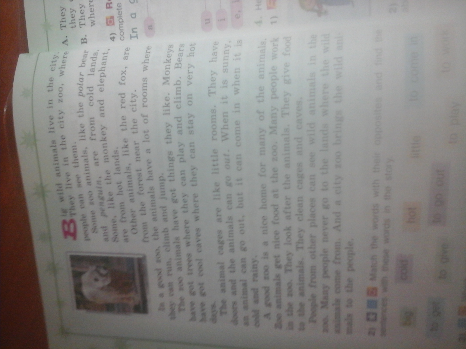 Животные в зоопарке имеют хорошую еду. В зоопарке работает много людей. Они присматривают за животными. Они дают им еду. Чистят их клетки и пещеры.
