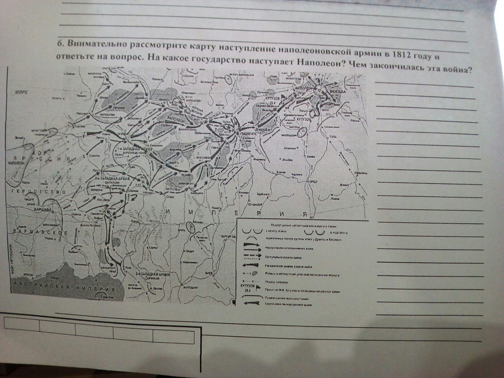 6)Внимательно рассмотрите карту наступления наполеоновской армии в 1812 году и ответьте на вопрос. На какое государство наступает Наполеон? Чем закончилась эта война*?(на фото)