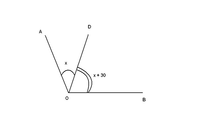 угол АОВ равен 150 градусов. Луч ОD делит угол АОВ на углы АОD и DОВ. градусная мера угла АОD на 30 градусов меньше градусной меры угла DOB. определите градусную меру угла DОВ