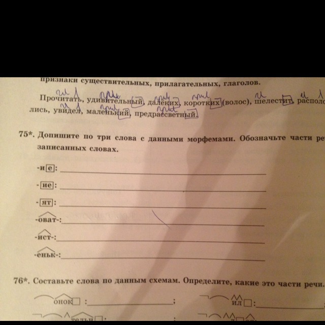 Доришите по три слова с данными морфемами . Обозначьте части речи в записанных словах . Номер 75