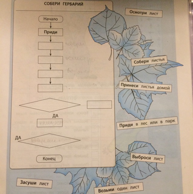 Впиши на схеме алгоритма первые слова команд подсказок. Запиши вопросы в ромбах, нарисуй стрелки и впиши слово "НЕТ". Обведи команды, которые выполняются больше одного раза.