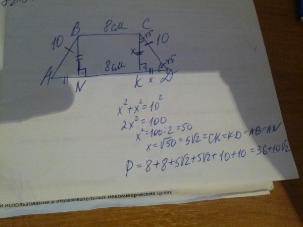 меньшее основание равнобедренной трапеции равно 8 см , боковая сторона 10 см, а острый угол при основании 45 градусов. Найдите периметр равнобедренной трапеции.