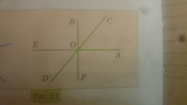 На рисунке 61 прямые AE и BF взаимно перпендикулярны. Найдите углы BOC, EOD и AOD, если AOC = 50 градусов