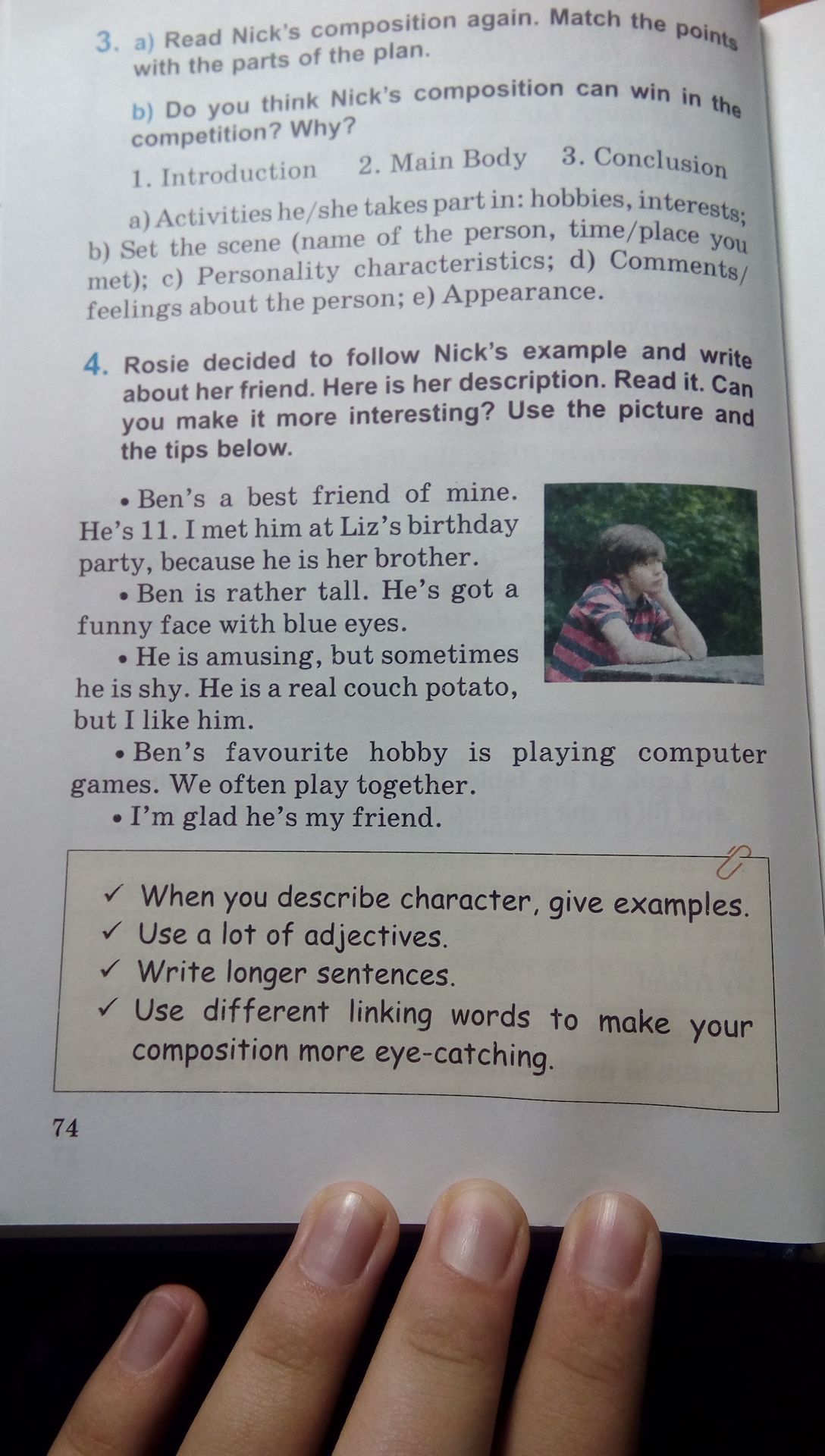 Помогите с английским языком! Срочно, очень надо. Побыстрее. На всякий случай, там надо дополнить текст прилагательными, описанием характера, примерами, написать длинное предложение, и использовать составные прил. например ( blue-eyed)