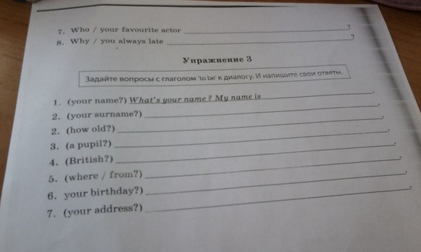 what's your surname? My surname is ...( свою фамилию, видимо, нужно вписать,потомучтовопроспереводится как твоя фамилия? 2 How old are you? I am... (добавить возраст) Вопрос сколько тебе лет ответ мне и нужно цифру подставить сколько лет. 3 Are you a pupil ? Ты ученик( ученица? ) Yes, I am. - Да. 4 Are you British? No, I am not. 5 Where are you from ? I am from Russia. 6. When is your birthday ? My birthday is on the ... добавить дату рождения ,например My birthday is on the 5 th of April - Мой День рождения пятого Апреля. Whats your adress? My adress is ... ( свой адрес ) Предлагаю такое решение