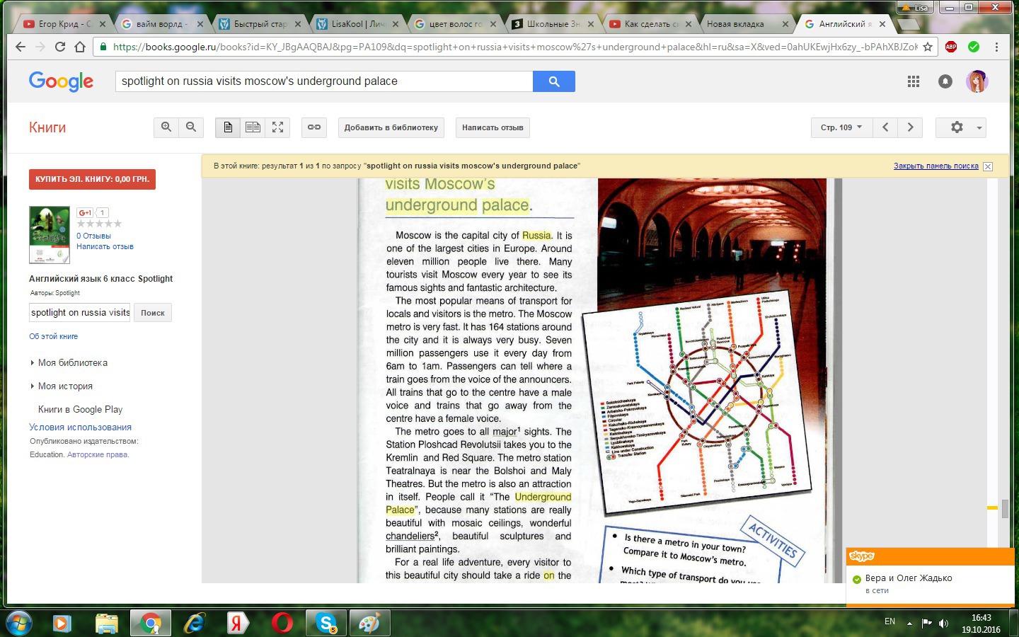 Москва является столицей России. Это один из самых больших городов в Европе, около одиннадцати миллионов человек живут там. MAMY туристы посещают Москву каждый год, чтобы увидеть знаменитые достопримечательности и фантастической архитектурой. Самым популярным средством передвижения для местных жителей и посетителей метро. Московское метро очень быстро. Он имеет 164 станций по всему городу, и это всегда очень занят. Семь миллионов пассажиров используют его каждый день с 6 утра до 1 часа ночи. Пассажиры могут сказать, где поезд идет от голоса дикторов. Все поезда, которые идут в центре есть мужской голос и поезда, которые идут от центра имеют женский голос. Метро идет от всех основных достопримечательностей. Станция Ploshcad Революции доставит вас до Кремля и Красной площади. Станция метро Театральная находится вблизи Большого и Малого театров. Но метро также привлечение в себе. Люди называют это "подземный дворец", потому что многие станции действительно красивы с мозаичными потолками, прекрасные люстры красивые скульптуры и яркие картины. Для реальной жизни Euvenu каждый VISIur Юр, этот красивый город Шол на