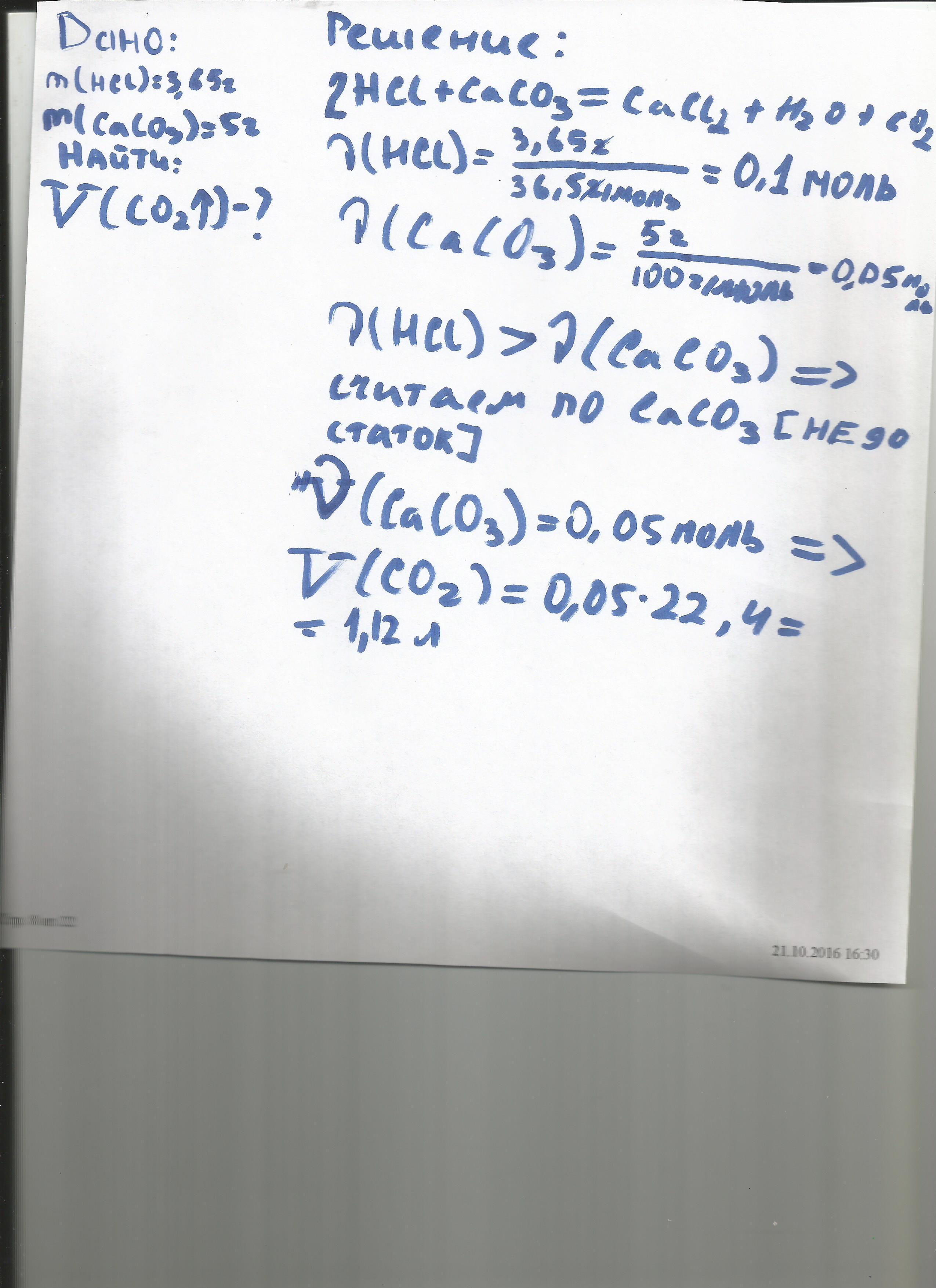Найдите объем углекислого газа, получившегося при действии 3,65 г соляной кислоты на 5г карбоната калиция.