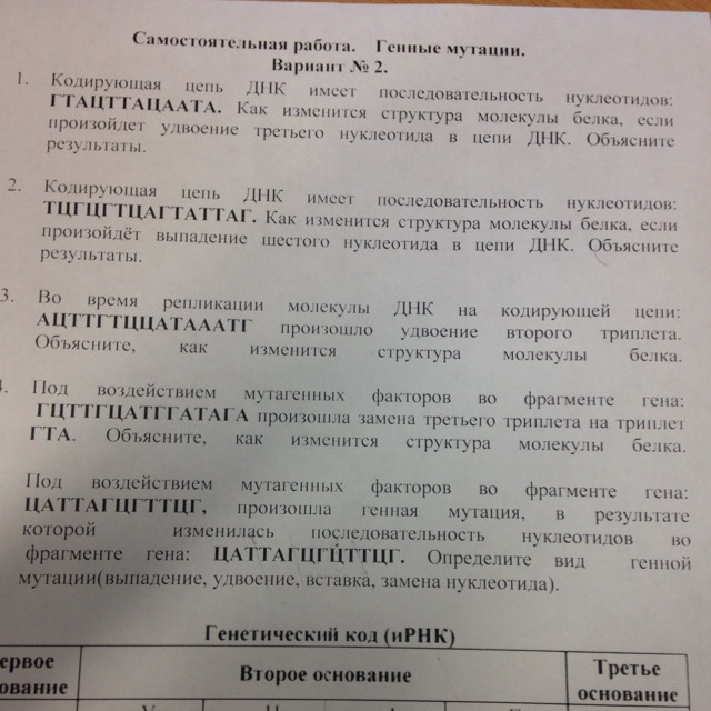 1. цепь днк станет ГТААЦТТАЦААТА, а значит изменится и последовательность аминокислот в синтезируемом белке( вторая аминокислота станет другой)
