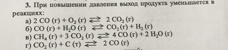 При повышении давления выход продукта уменьшается в реакциях: