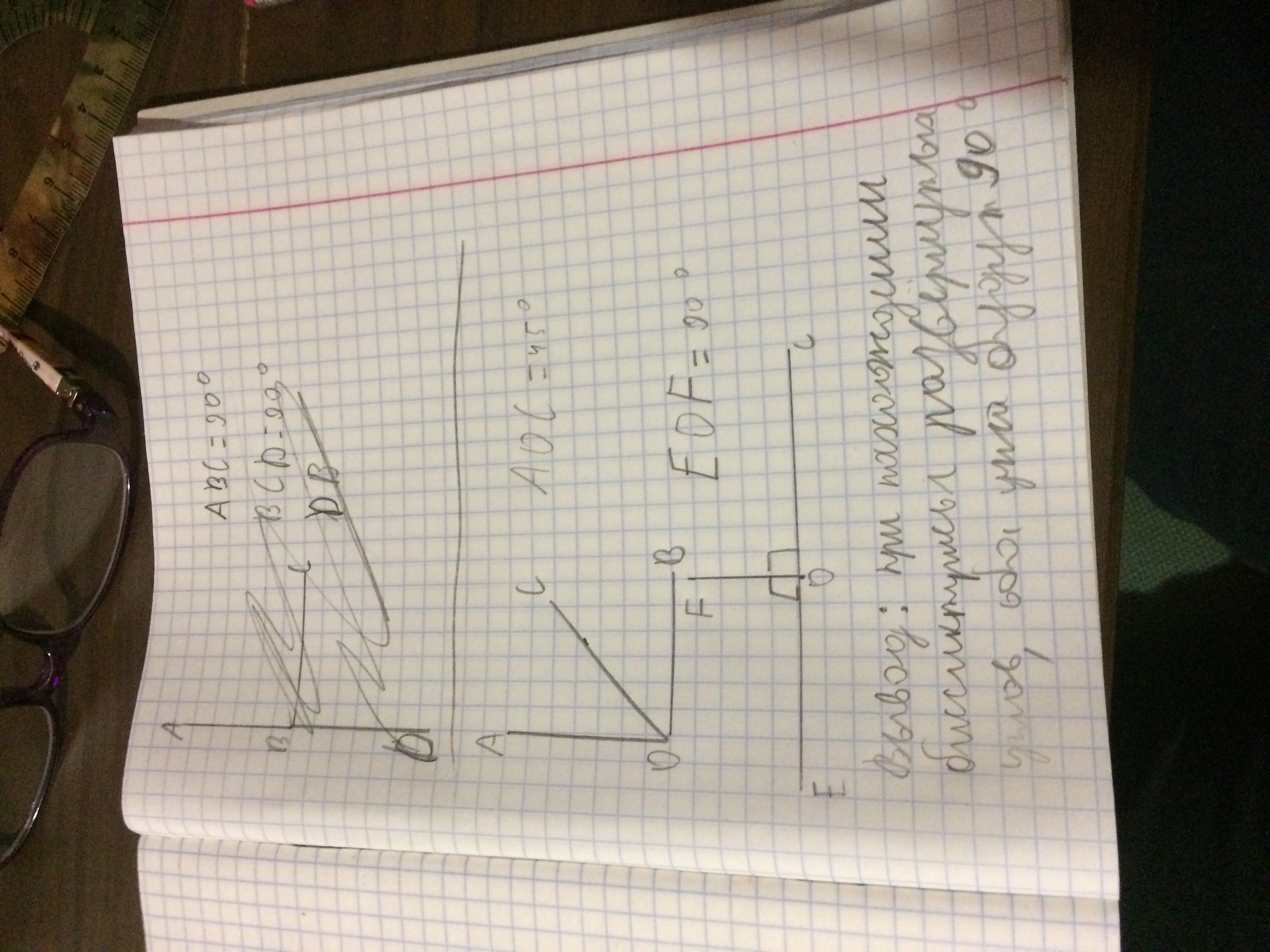 начертите прямой угол AOB проведите биссектрису OC сколько градусов содержит угол AOC? начертите развернутый угол EOC проведите биссектрису OF сколько градусов содержит угол EOF? какие углы получились при этом? сделайте вывод