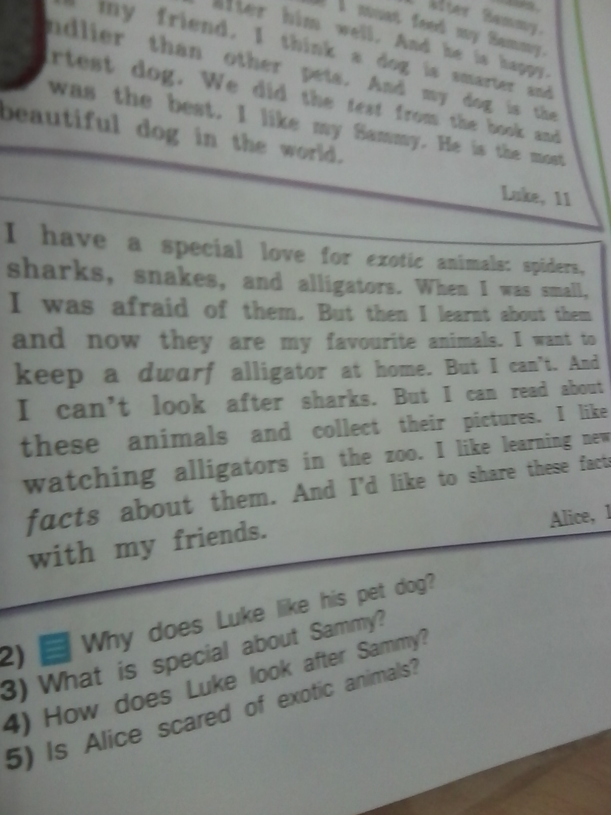 Мне очень нравятся экзотические животные пауки, акулы, змеи, аллигаторы. Когда я был маленьким, я боялся их. Но позже я прочитал о них и сейчас это мои любимые животные. Я хочу держать аллигатора дома. Но я не могу. И я не могу наблюдать за акулами. Но я могу читать о этих животных и коллекционировать картинки с ними. Мне нравится наблюдать за аллигаторами в зоопарке. Мне нравится узнавать новые факты о них. И мне нравится делится этими фактами со своими друзьями
