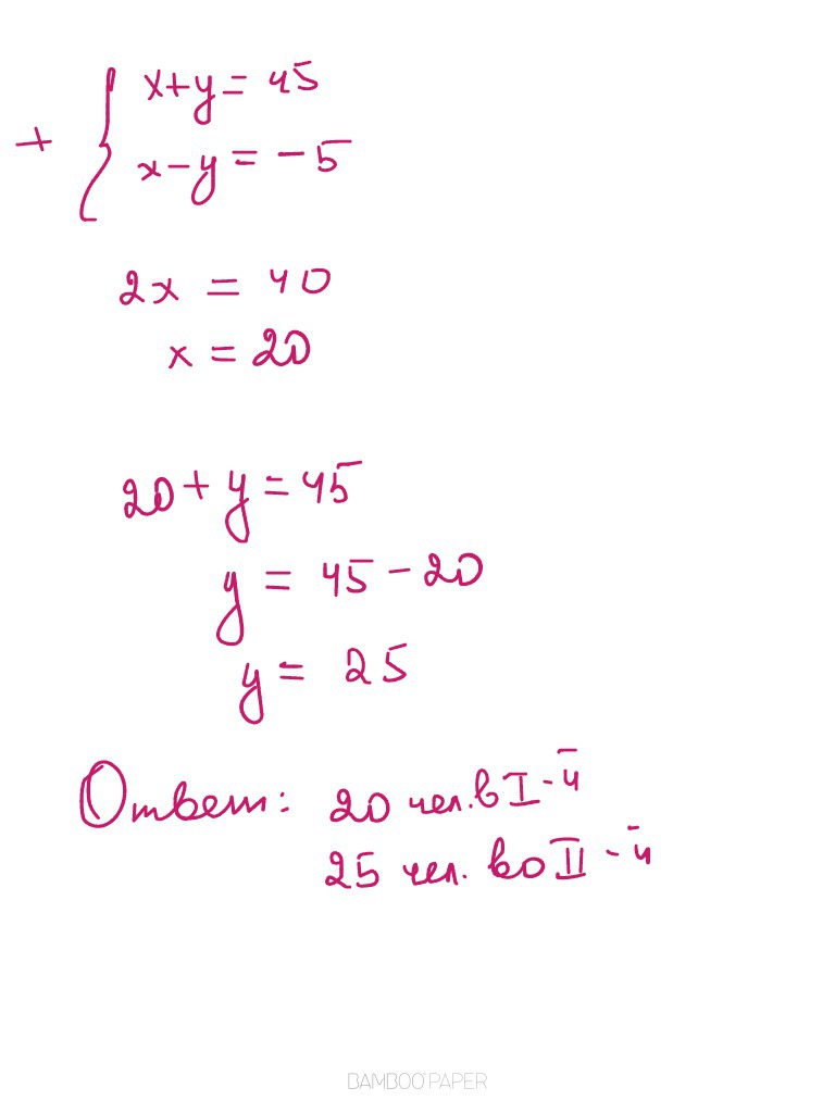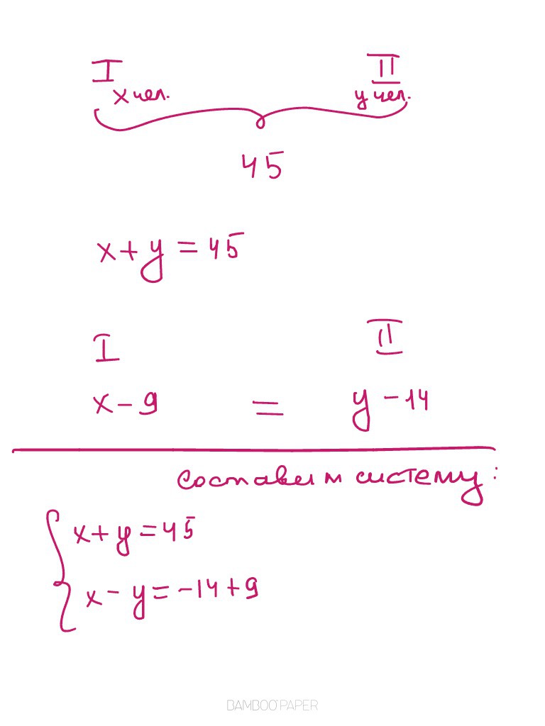 В двух комнатах были 45 человек. Когда первой вой вышли 9 человек, а из второй 14 человек, то людей в комнатах стало поровну. Сколько человек было в каждой комнате первоначально?