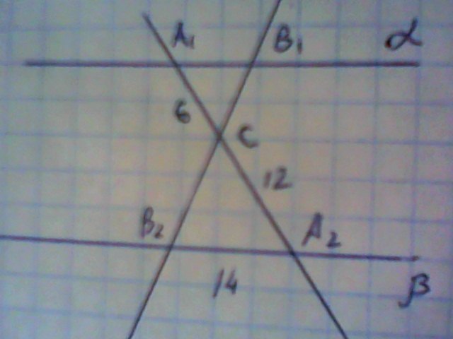 Даны две параллельные плоскости α и β. Из точки С лежащей между этими плоскостями проведены две прямые, которые пересекают плоскость α в точках А1 и В1, плоскость β в точках А2 и В2 соответственно, причем СА1 = 6дм, А1 А2 =18дм, А2В2= 14дм. Найти длину А1В1.(ОТДАЮ 40 баллов помогите плиз)