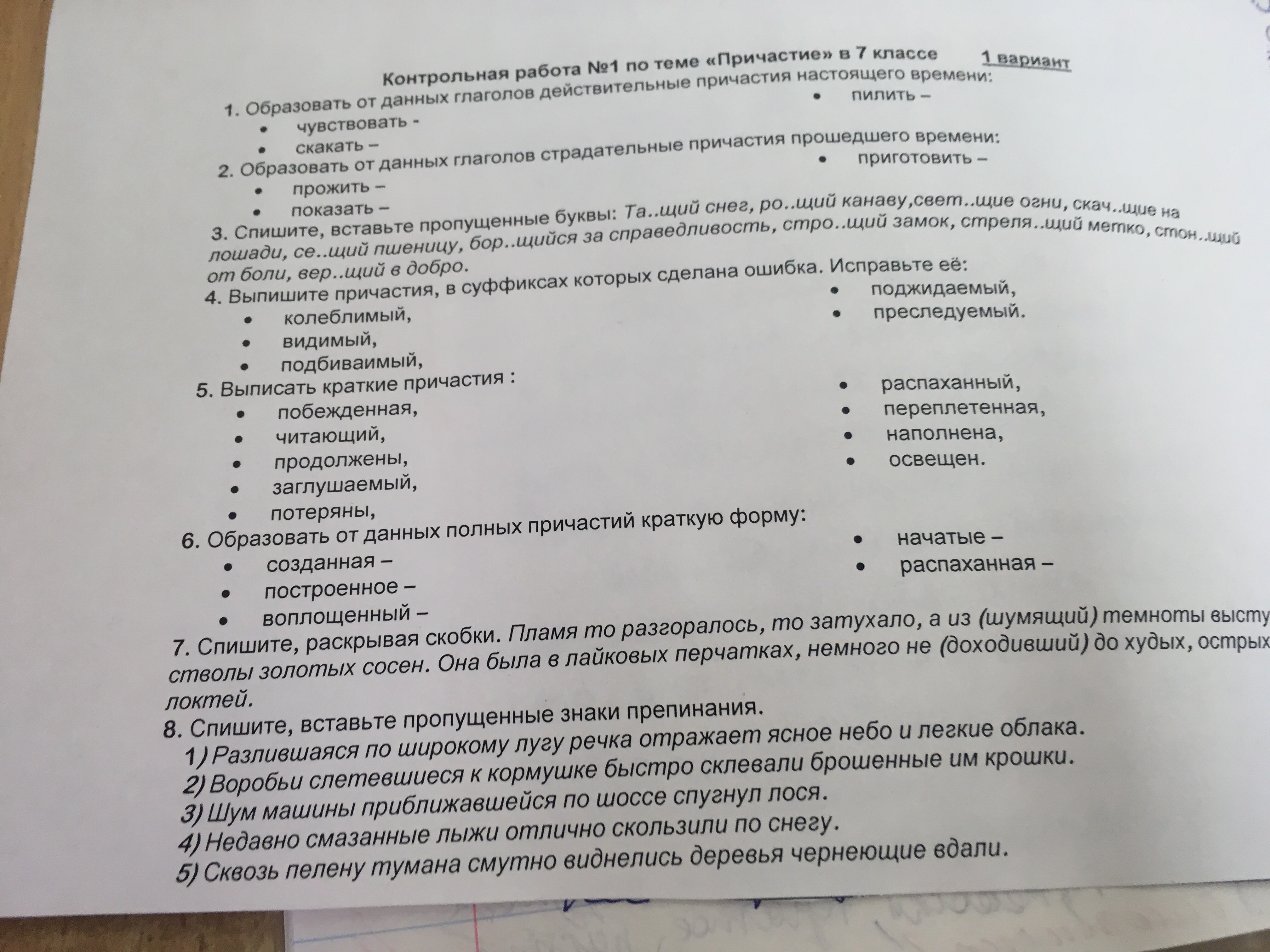 8) Разлившаяся по широкому лугу речка, отражает ясное небо и легкие облака. Воробьи, слетевшиеся к кормушке, быстро склевали брошенные им крошки. Шум машины, приближающейся по шоссе, спугнул лося. Недавно смазанные лыжи, отлично скользили по снегу. Сквозь пелену тумана смутно виднелись деревья, чернеющие вдали