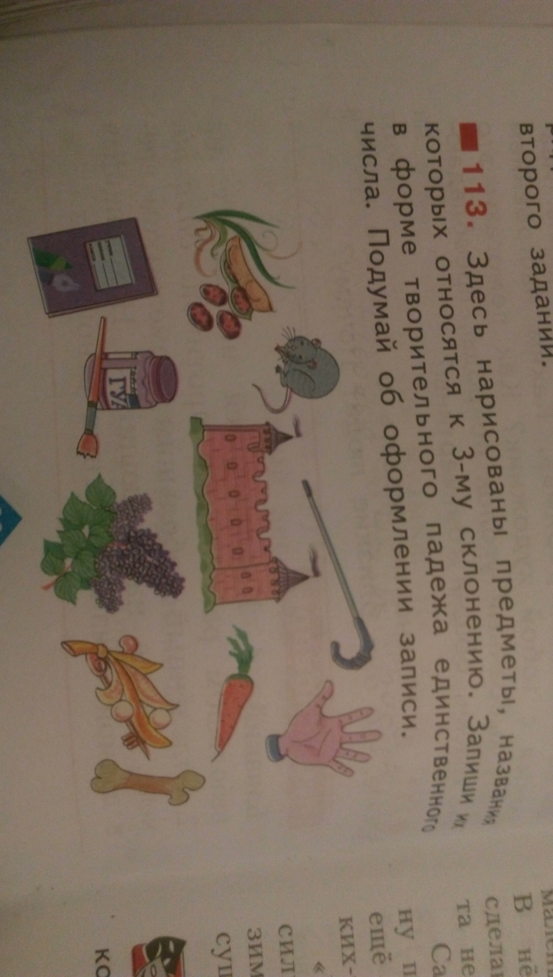 Бобами, тетрадью,мышью, гуашью, замком, тростью, рукой, морковью, букетом сирени, брошью, костью.